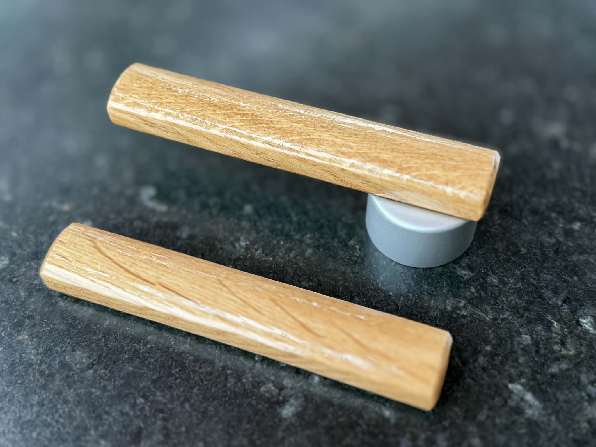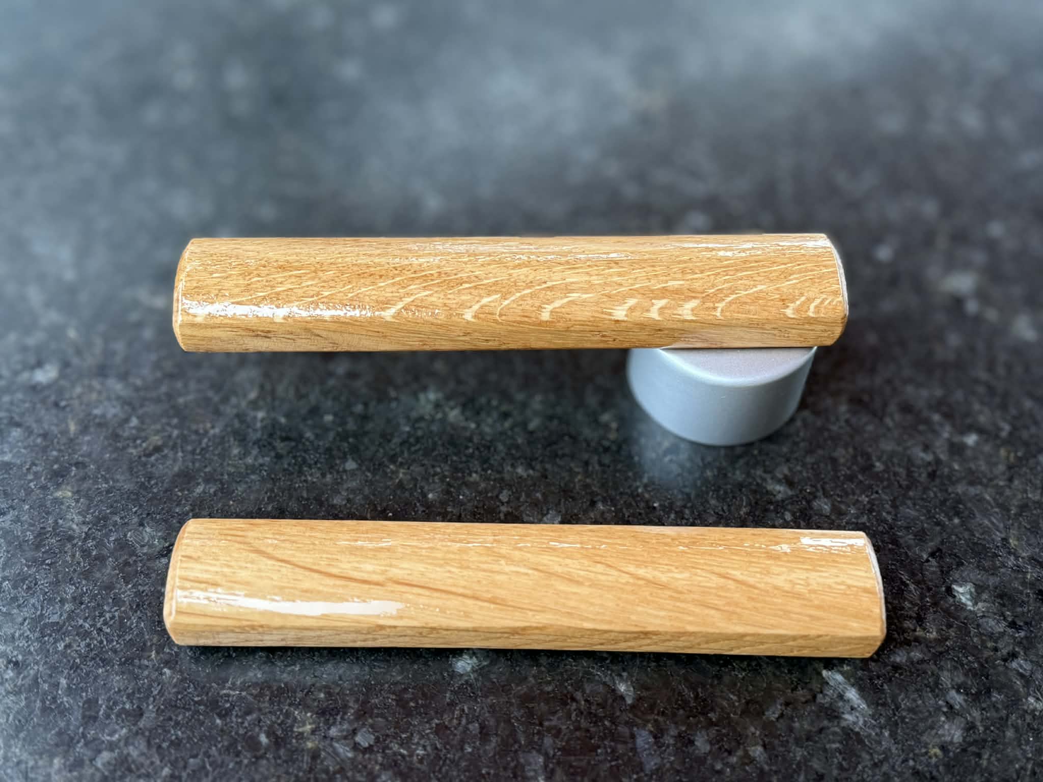 Lieferung: 2 x Holzgriffe in Eichenholz + Schrauben für die Befestigung am Sockel.